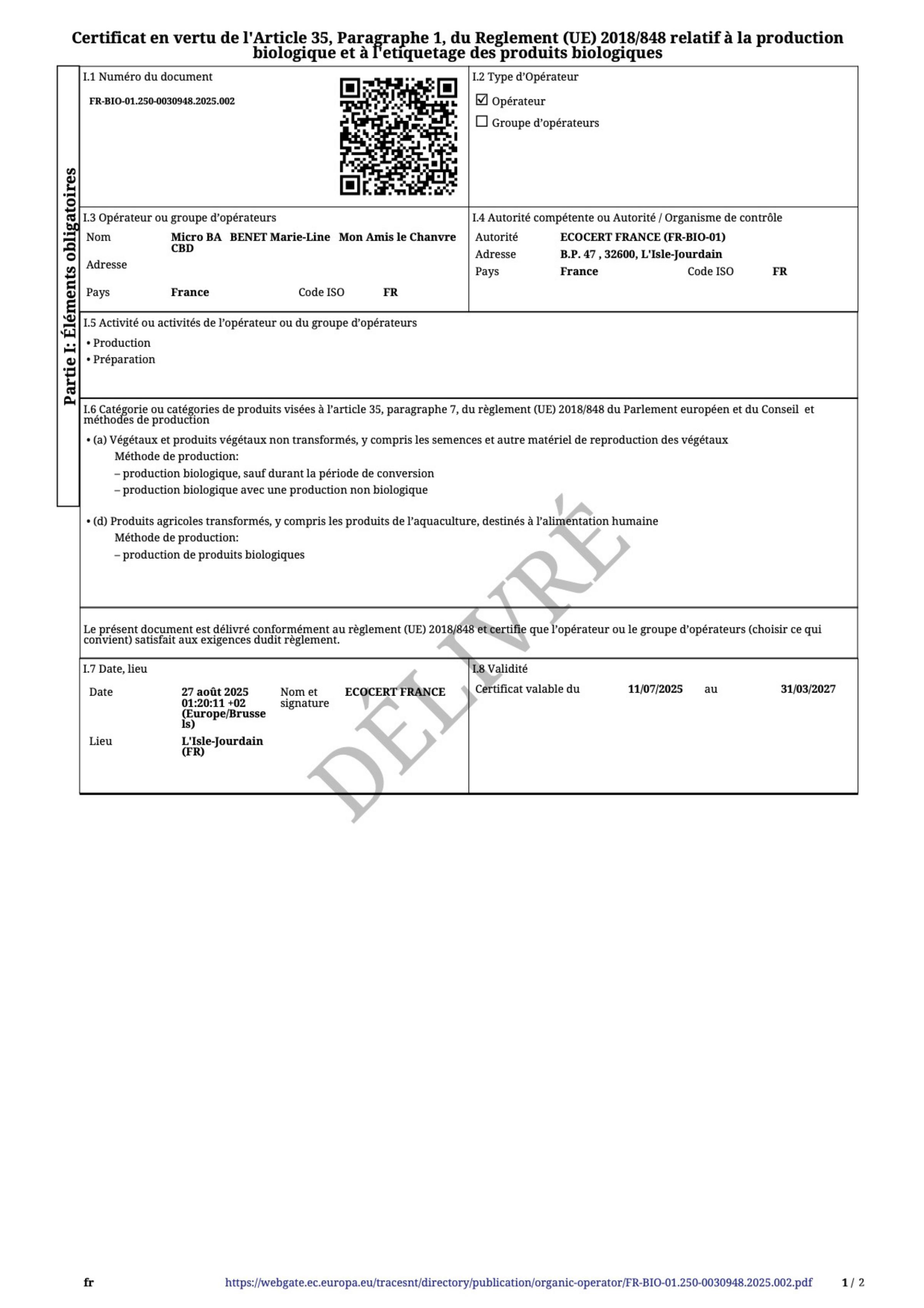 Culture de chanvre certifiée Bio par Ecocert en Provence dans le Vaucluse.