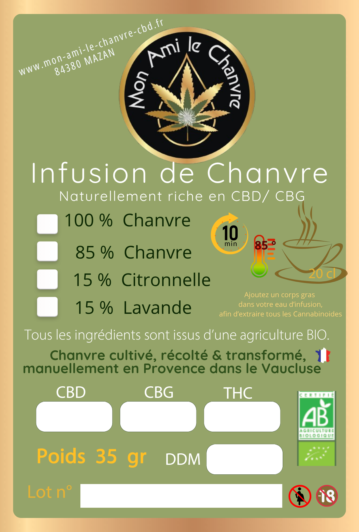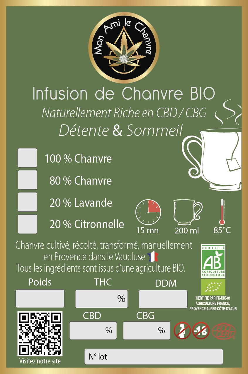 Mes infusions sont faites avec ma production de fleurs de chanvre bio naturellement riches en cannabinoïdes ces infusions vous apporteront calme et sérénité et vous faciliteront le sommeil.