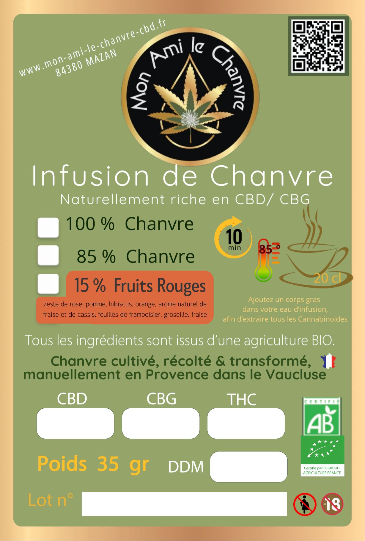 Ingrédients : 85 % Chanvre, 15 % Fruits rouges
